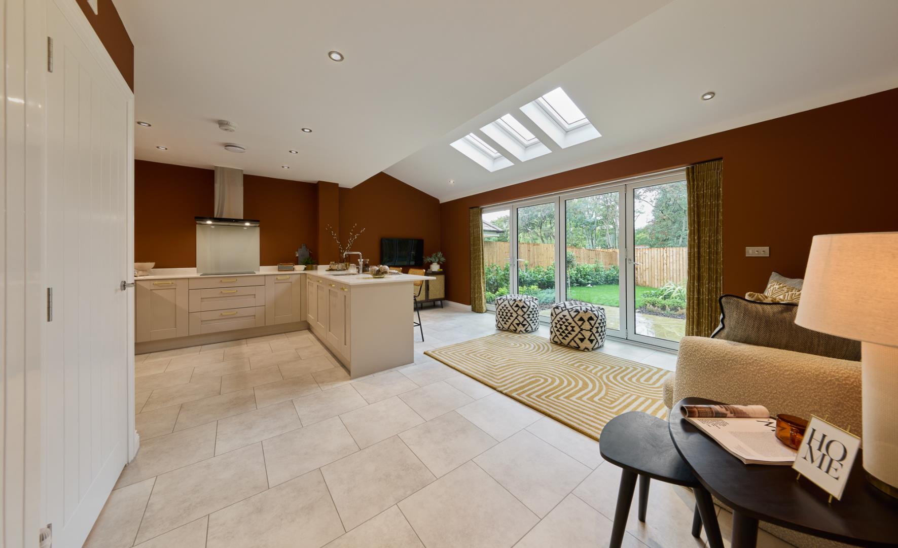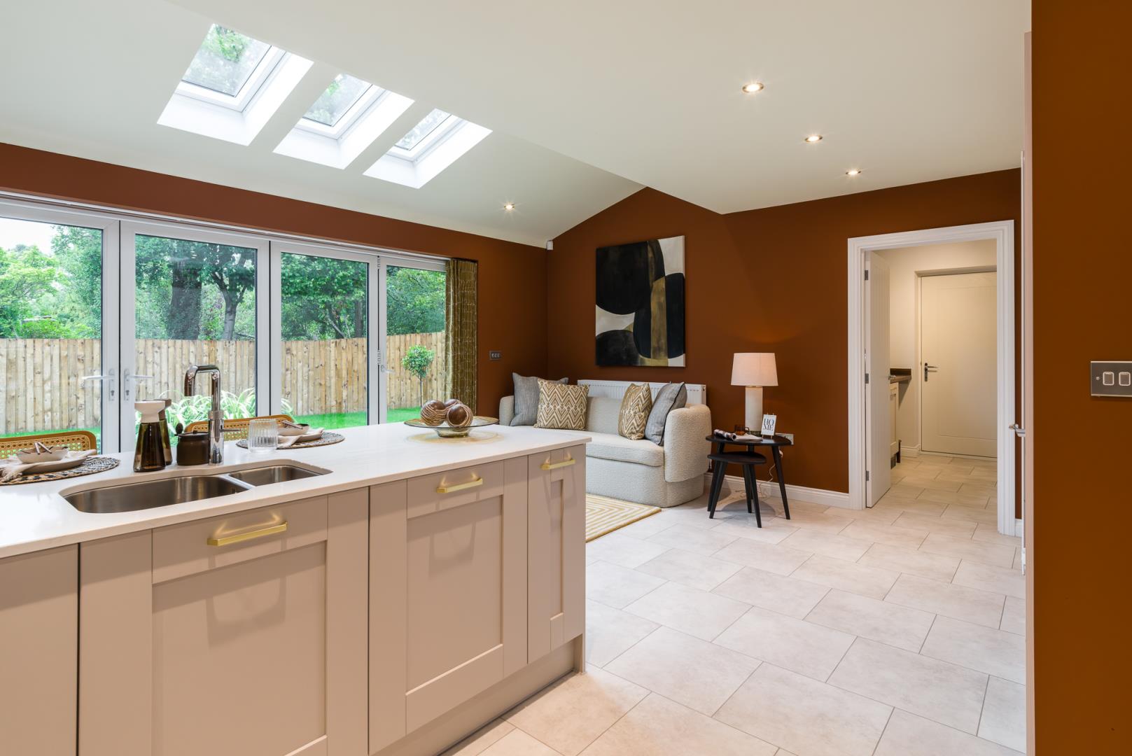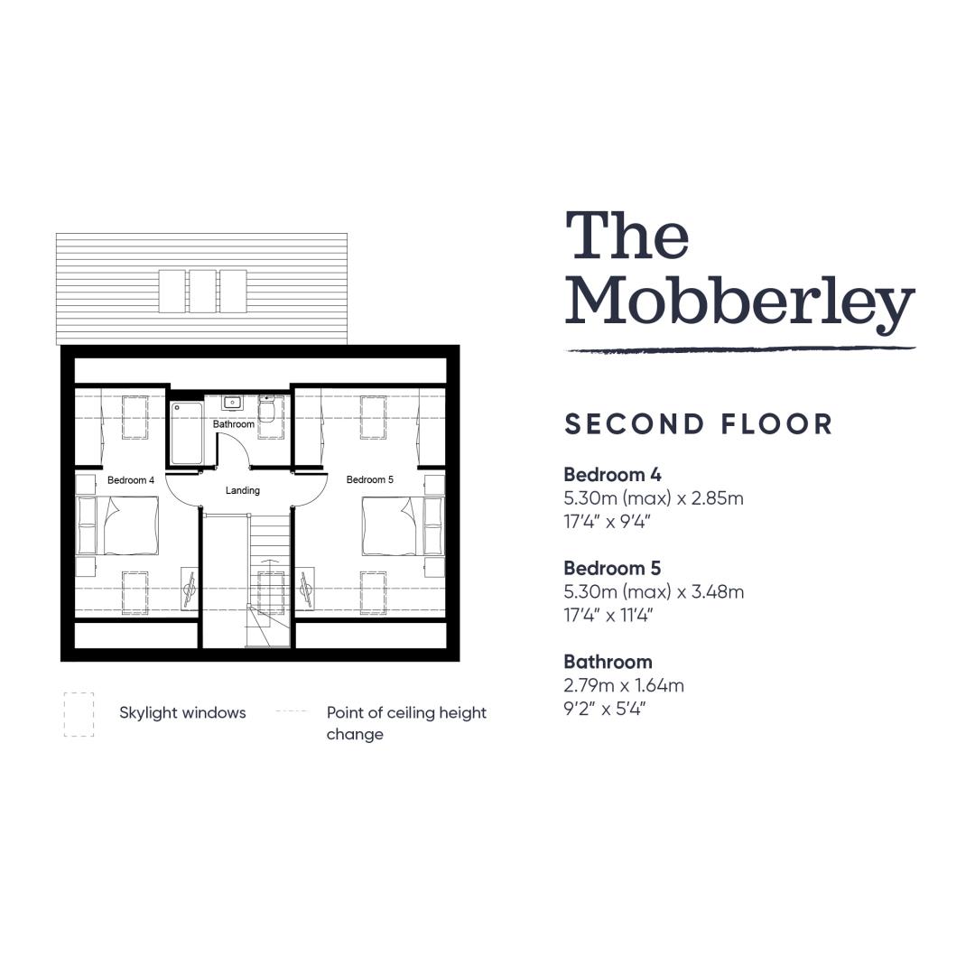 THE MOBBERLEY is a five bedroom detached executive family home, with large open plan kitchen and family room with feature roof light windows and access to the rear garden through French doors. Useful utility room, separate living room and dining room, downstairs WC. Five spacious bedrooms, dressing area to the main bedroom and ensuites to both the main and second bedrooms, two further family bathrooms, storage and and detached double garage.